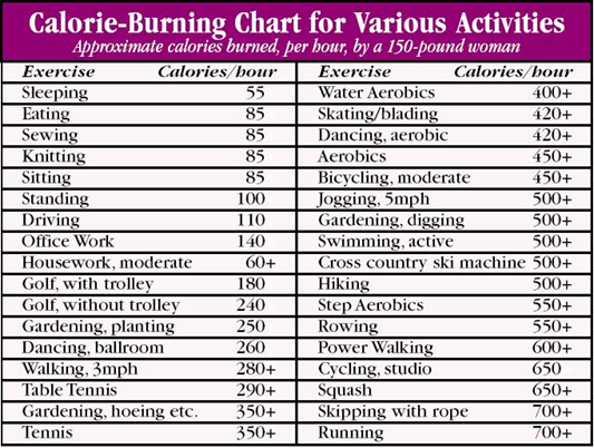 I know I am all over the place today but here’s another subject - while I was at the doctor’s office, I saw this interesting snippet in Health Magazine about spin classes. It said something like people don’t lose weight doing really high intensity workouts like spin because they overestimate how many calories they burn and eat too much later in the day. I am not trying to lose weight, but thought that was kind of interesting. Below is a chart of the number of calories burned certain activities.